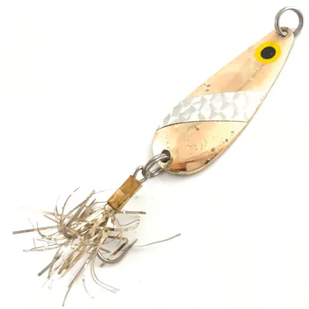 10 g:n paino tekee tästä Lindy Finsel -lusikasta monipuolisen valinnan useille eri makean veden lajeille. Tämän 5,5 cm:n lusikkauistimen kultaisessa viimeistelyssä on erottuva hopeinen suomukuvioinen nauha keskellä, mikä tuo kontrastia heijastavaan pintaan. Selkeä keltainen silmä mustalla pupillilla sijaitsee lähellä yläkiinnityspistettä, ja kääntöpuolelle on selvästi leimattu Finsel-nimi, mikä osoittaa sen alkuperän Lindy / Little Joe -merkiltä USA:sta. Tämä nimenomainen malli, tuotekoodiltaan 4527, on varustettu kolmihaarakoukun hopeisella tinselipyrstöllä, joka antaa hienovaraista välkettä. Kuntoarviolla 4/5 kultaus osoittaa lieviä iän merkkejä pehmeällä ja aidolla hohdolla. Rakenne on viimeistelty kestävillä uistinrenkailla, jotka on suunniteltu kestämään voimakkaan kalan vetoa.