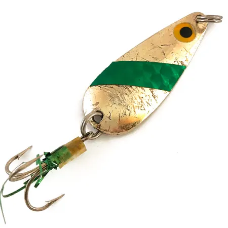 Kultaus peittää tämän 10 g (1/3 oz) lusikkauistimen rungon, korostaen Lindy / Little Joe -vieheen klassista muotoilua. 5,5 cm (2 1/4") pituisen lusikkaosan etupuolella kulkeva vihreä diagonaalinen raita hunajakennokuviolla tuo selkeän visuaalisen lisän kultaiseen viimeistelyyn. Tässä Lindy Finsel -mallissa, tuotekoodiltaan 4798, on keltainen ja musta maalattu silmä lähellä siiman kiinnityskohtaa. Yhdysvalloissa valmistetussa uistimessa on joitakin kevyitä pintajälkiä vieherasiassa säilytyksestä, mutta se on säilyttänyt vankan 4/5 kuntoluokituksen. Lusikan takapuolella on meistetty mallinimi, mikä on tyypillinen laatumerkki tämän aikakauden amerikkalaisessa valmistuksessa. Pyrstöön on kiinnitetty kolmihaarakoukku, jossa on vihreitä tinsel-koristeita ja keltaista letkua. Tukevat uistinrenkaat molemmissa päissä tekevät siitä valmiin erilaisiin heitto- ja uistelutekniikoihin.