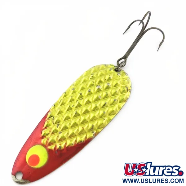 Tämä peräti 55 grammaa (2 oz) painava Lindy Gator -lusikkauistin edustaa amerikkalaisten heitto- ja uisteluvieheiden raskaampaa sarjaa. Rungon pituus on 11,5 cm (4 1/2"), ja siinä on syvänpunainen viimeistely sekä voimakkaasti kohokuvioitu suomupinta, joka heijastaa valoa tehokkaasti laajalle alueelle. Vieheen alaosassa oleva selkeä, punakeskinen keltainen iskusilmä toimii perinteisenä ärsykkeenä punaisen ja nikkelinvärisen rungon keskellä. Tämä Yhdysvalloissa valmistettu yksilö, tuotekoodiltaan 23800, on säilyttänyt erittäin hyvän viimeistelynsä, jonka kuntoluokitus on 4/5. Suuri, tummapintainen kolmihaarakoukku on kiinnitetty tukevalla uistinrenkaalla, mikä on tyypillistä Lindy / Little Joen suosimille kestäville komponenteille. Paksu metallirunko varmistaa, että uistin säilyttää uintisyvyytensä ja vakaan uintinsa tasaisessa kelauksessa.