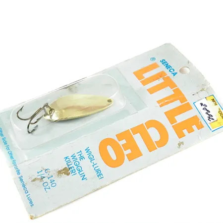 Kultaus antaa ajattoman viimeistelyn tälle 7g (1/4 oz) lusikkauistimelle, joka on painoluokkana osoittautunut tehokkaaksi vuosikymmenten ajan sekä makeassa että suolaisessa vedessä. Kooltaan 4 cm (1 1/2") oleva Seneca Little Cleo kantaa tuotekoodia 2882 ja edustaa merkittävää aikakautta kalastusvälinehistoriassa ennen kuin Acme osti brändin 1980-luvun alussa. Tämä yksilö on erityisen huomionarvoinen koveralla puolella olevan Hula-tyttö-leiman ansiosta – yksityiskohta, jonka monet veteraanikalastajat uskovat vaikuttaneen uistimen legendaariseen maineeseen ennen muotoilun yksinkertaistamista. Uistin on käyttämätön (kuntoarvio 6) ja se on edelleen alkuperäisessä vintage-läpipainopakkauksessaan. Taustapahvi kertoo Senecan sijainnin Providence, RI:ssä ja antaa ohjeet heitto- ja vetouisteluun pstruun, lohen ja piikkihauen pyyntiin. Varustukseen kuuluu tehtaan alkuperäinen kolmihaarakoukku, jossa ei ole merkkejä iästä tai kulumisesta.