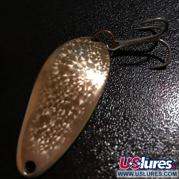 Pakotetun kultarungon monitahoiset pinnat erottavat tämän Seneca-aikakauden Little Cleo Crystal -lusikan, joka on osa amerikkalaista kalastushistoriaa ja valmistettu ennen Acmen suorittamaa haltuunottoa 1980-luvun alussa. Painoltaan 1/4 oz (7 g) oleva lusikkauistin on pituudeltaan 1 1/2" (4 cm), ja sen koveralla puolella on selkeä "LITTLE CLEO WIGL-LURE A SENECA LURE" -leima. Crystal-väri viittaa erityiseen monikulmaiseen tekstuuriin, joka on suunniteltu heijastamaan valoa, ja se on varustettu klassisella kuparinvärisellä uistinrenkaalla sekä terävällä alkuperäisellä kolmihaarakoukulla. Yhdysvalloissa valmistettu yksilö kantaa tuotekoodia 8326 ja on säilynyt 5/5-kunnossa. Sen paksu, kaareva profiili heijastaa alkuperäistä heitto- ja uistelukalastukseen tarkoitettua Seneca-suunnittelua, edustaen uistinvalmistuksen tiettyä aikakautta ennen brändin siirtymistä Acmelle.