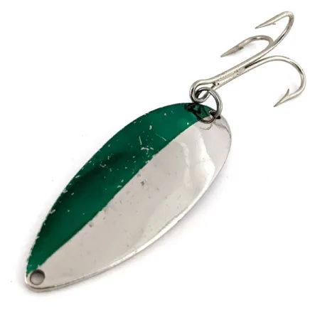 Tämän 21 g (3/4 oz) lusikkauistimen etupuolella on näyttävä vinottainen halkaisu metallisen smaragdinvihreän ja kiillotetun nikkelin välillä. Kääntöpuolelle on stanssattu selkeästi tunnistettava 'Hula Girl' -tanssija, joka on alkuperäisen Seneca-tuotannon tunnusmerkki ennen merkin siirtymistä Acmelle 1980-luvun alussa. Tämä yksilö (tuotekoodi 15240) edustaa klassista pisaranmuotoista profiilia, joka on tehnyt Little Cleo -uistimesta vakiovarusteen kalastuspakkeihin vuosikymmenten ajan. Kääntöpuolelta löytyvät myös merkinnät 'WIGL LURE' ja '3/4 OZ', jotka viittaavat sen vintage-alkuperään. Vieheessä on vankka kolmihaarakoukku, joka on kiinnitetty takapäähän tukevalla uistinrenkaalla. Metallipinta on edelleen kirkas, ja tarkemmassa tarkastelussa näkyy vain vähäisiä pintanaarmuja, mikä oikeuttaa kuntoarvioon 4/5. Keräilijät etsivät usein juuri näitä versioita tanssijakaiverruksen vuoksi, ja monet kokeneet kalastajat uskovat sen tuovan erityistä etua kalastuksessa. Etureunan reikä on siististi meistetty suoraa siiman kiinnitystä tai viehelukkoa varten.