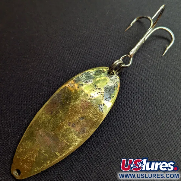 Runkoon on selvästi stanssattu 'WIGL LURE' -nimi; tämä 21 gramman (3/4 oz) messinkinen lusikkauistin kantaa Senecan varhaisen tuotannon perintöä. Pituudeltaan 6,5 cm (2 1/2") uistimen metallipinnassa on merkittävää kulumaa ja tummumista, mikä heijastaa sen ikää ja käyttöhistoriaa, johtaen kuntoluokitukseen 3/5. Koveralla puolella on pidetty 'Hula Girl' -tanssijaleima, joka on alkuperäisen Seneca-aikakauden tunnusmerkki ennen kuin brändi siirtyi Acmen omistukseen 1980-luvun alussa. Tuotekoodilla 15986 listattu uistin on varustettu perinteisellä kolmihaarakoukulla ja uistinrenkaalla. Messinkinen pohja on edelleen vankka, ja siinä on kauttaaltaan syvä, ajan patinoima ulkoasu.
