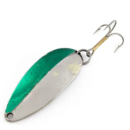 Tämän 5,5 cm (2 1/4") heittolusikan etupuoli on jaettu nikkeli- ja vihreään metallinhohtoiseen pintaan, mikä on tunnusomaista klassiselle Seneca-tuotannolle. Tässä Little Cleo (HULA GIRL) -uistimessa on kääntöpuolella ikoninen tanssijaleima – keräilijöiden arvostama yksityiskohta, jonka Acme poisti käytöstä ostettuaan tuotemerkin 1980-luvun alussa. Kääntöpuolelle on stanssattu ”WIG-L LURE” ja ”LITTLE CLEO”, ja se on säilyttänyt kiillotetun hohdon. Viehe painaa 18 g (2/3 oz), ja se on varustettu kolmihaarakoukulla, jonka varressa on sille ominainen messinkikierros. Tuotekoodilla 20638 tunnistettu yksilö on kuntoluokassa 4/5; sen vihreässä maalipinnassa on hieman rehellistä kulumaa, joka kertoo vieheen historiasta. Se on valmistettu Yhdysvalloissa aikakautena, jolloin ”Hula Girl” oli kalamiesten suosima onnenkalu ympäri maata. Vankka uistinrengas varmistaa, että koukutus pysyy tukevasti paikoillaan heitettäessä.