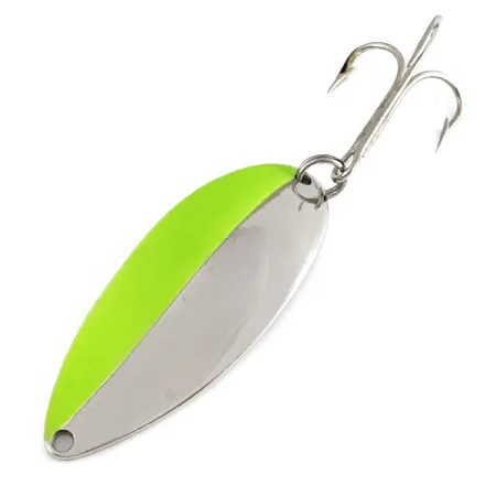 Tämä järeä 21 gramman (3/4 unssia) heittolusikka on viimeistelty näyttävällä nikkeli-neonvihreällä puolituksella. Pituudeltaan 6,5 cm (2 1/2") uistimen koveralle puolelle on stanssattu ikoninen "Hula Girl" -tanssija – Seneca Lure Companyn aikakaudelle tyypillinen yksityiskohta. Monet kokeneet kalastajat vannovat edelleen juuri tämän "tanssija"-mallin nimeen, joka valmistettiin ennen kuin Acme osti yrityksen 1980-luvun alussa ja kaiverrus lopulta poistui käytöstä. Tuotekoodilla 21764 tunnistettu yksilö on erinomaisessa kunnossa (arvosana 5/5), ja sen kirkkaat pinnat sekä alkuperäiset koukut ja renkaat ovat loistavassa terässä. Tämä Yhdysvalloissa valmistettu klassikko on riittävän painava pitkiin heittoihin syvissä vesissä, joissa nikkelin välke on tehokkaimmillaan.