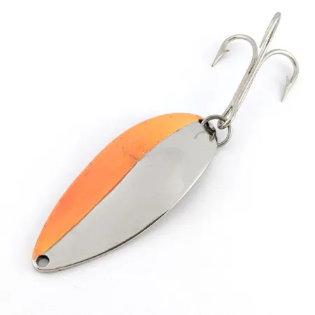 Keskeltä tasan jaettu nikkelin ja kirkkaan oranssin väritys tässä Seneca-lusikkauistimessa kiinnittää heti huomion. Pituudeltaan 6,5 cm (2 1/2") ja painoltaan 21 g (3/4 oz) oleva yksilö on varustettu kääntöpuolelle stanssatulla klassisella tanssijatytöllä, joka on alkuperäisen Seneca Lure Companyn tunnusmerkki ennen 1980-luvun Acme-yrityskauppaa. Monet kokeneet keräilijät suosivat näitä "Hula Girl" -malleja, sillä kaiverrettu hahmo poistettiin myöhemmistä tuotantoeristä. Kiillotettu metallipinta on 5/5-kunnossa, eikä alkuperäisessä viimeistelyssä näy merkittäviä kulumisen jälkiä. Uistimen taustapuolelle on stanssattu tuotekoodi 22112, ja siinä näkyvät selkeästi myös paino sekä valmistusmaa. Tukeva kolmihaarakoukku on kiinnitetty tukevasti alaosaan, ja se on valmis perinteiseen heittokalastukseen tai vetouisteluun.