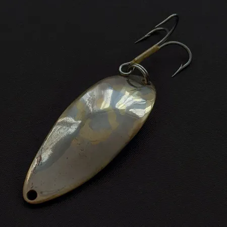 Kiillotettu nikkelipinnoite paljastaa kuparin ja kullan sävyjä tämän 5,5 cm (2 1/4") lusikkauistimen kääntöpuolella. Tämä yksilö, tuotekoodiltaan 22673, edustaa klassista Seneca Lure -tuotantokautta ennen kuin Acme osti brändin 1980-luvun alussa. Ikonisella "Hula Girl" -tanssijalla ja "WIGL LURE" -merkinnällä varustettu 18 g (2/3 oz) uistin on säilyttänyt sen luonteen, jota kokeneet kalastajat pitävät sen legendaarisen menestyksen salaisuutena. Tanssijakuva on keräilijöiden arvostama yksityiskohta, sillä myöhemmissä versioissa tästä tarkasta kaiverruksesta luovuttiin. Kuntoluokituksella 3/5, metallipinnassa on havaittavissa uistinpakissa vietetyn ajan tuomaa patinaa, mutta varusteet ovat yhä tukevat. Uistinrengas on kiinnitetty vintage-malliseen kolmihaarakoukkuun, jossa on tallella alkuperäinen pronssimainen viimeistely.