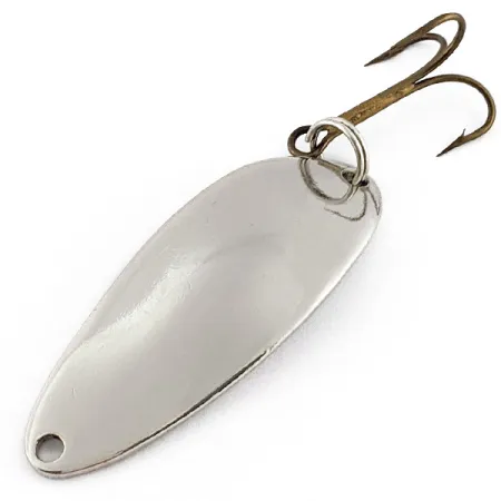 Tämän 4,5 cm:n (1 3/4") lusikkauistimen nikkelipinnoite takaa kirkkaan välkkeen, joka on säilyttänyt paikkansa monen kalastajan vieherasiassa. Erottuva 'Hula Girl' -kuvio ja tuotemerkki on stanssattu selkeästi metalliin, mikä on klassinen yksityiskohta uistimen valmistusajoilta Senecan tehtaalla USA:ssa. 10 gramman (1/3 oz) painoisena viehe on riittävän tiivis mahdollistaakseen pitkät heitot tai hallitun vetouistelun. Tämä nimenomainen yksilö, tuotekoodiltaan 22885, on 5/5-kunnossa; sen pinta on kirkas ilman vanhoille metalliuistimille tyypillistä kulumista. Terävä pronssinvärinen kolmihaarakoukku on kiinnitetty tukevalla uistinrenkaalla, ja se on heti valmis veteen. Kärjessä on siististi stanssattu kiinnitysreikä, joka sopii joko suoraan solmuun tai viehelukkoon.