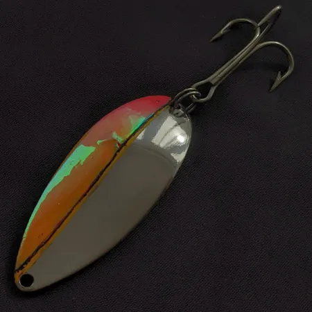 Tämä 21 gramman (3/4 oz) painoinen vankka lusikkauistin tarjoaa suurilla vesillä tarvittavaa heittopituutta. Tässä nimenomaisessa yksilössä (tuotekoodi 22982) on näyttävä nikkeli/puna-viimeistely, vaikka punainen puoli hehkuukin valossa upeana liukuvärinä, joka vaihtuu lämpimään oranssiin ja limenvihreään. Tämän Seneca-aikakauden Little Cleo (Hula Girl) -uistimen tekee keräilijöille erityiseksi sen kääntöpuolelle stanssattu ikoninen tanssijahahmo. Ennen kuin Acme osti Seneca Lure Companyn 1980-luvun alussa, jokaisesta aidosta Cleosta löytyi tämä hulatanssija – yksityiskohta, jota monet kokeneet kalastajat pitävät uistimen pyytävyyden salaisuutena. Lusikan pituus on 6,5 cm (2 1/2") ja sen pinta on kunnoltaan 4/5, säilyttäen kirkkaan kiillon ja värien terävät rajat epäsymmetrisessä rungossaan. Vaikka Acme jatkaa mallin valmistusta edelleen, tanssijatyttö-leima on jäänyt historiaan, mikä tekee näistä alkuperäisistä USA:ssa valmistetuista Seneca-versioista haluttuja keräilykohteita. Uistin on varustettu tukevalla kolmihaarakoukulla ja se on valmis joko käyttöön tai kunniapaikalle vintage-kokoelmaan.