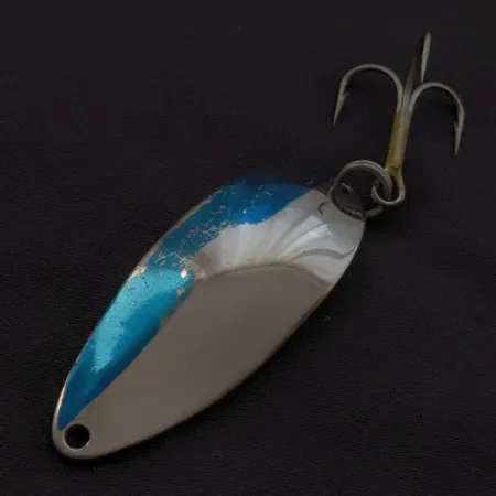 Kirkkaan sininen maali kiiltävällä kromipinnalla erottaa tämän 14 gramman (1/2 oz) vintage-lusikan myöhemmistä massatuotantomalleista. Tässä 5,5 cm:n (2 1/4") vieheessä on ikoninen, metalliin taustapuolelle meistetty ”Hula Girl” -tanssija, joka on alkuperäisen Seneca Lure -yhtiön tuotannon tunnusmerkki. Tämä nimenomainen grafiikka on keräilijöiden suosiossa, sillä tanssijahahmo poistui mallista pian sen jälkeen, kun Acme osti Senecan 1980-luvun alussa. Tuotekoodilla 23049 rekisteröity uistin on erinomaisessa 5/5-kunnossa, ja sen pinta on kirkas ja puhdas. Järeisiin osiin kuuluvat vahva uistinrengas ja terävä kolmihaarakoukku, jotka on suunniteltu pitkiin heittoihin – ominaisuuteen, joka teki tästä mallista luottovieheen vuosikymmeniksi. Syvä kromaus heijastaa valoa tehokkaasti yhdessä uistimen etupuolen täyteläisen sinisen korostuksen kanssa.