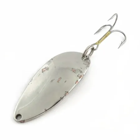 Kiillotettu nikkeli peittää tämän klassisen 14 gramman (1/2 oz) heittolusikan kuperan puolen, paljastaen vilauksia alla olevasta kuparipohjasta. Pituudeltaan 5,5 cm (2 1/4") oleva yksilö edustaa alkuperäistä yhdysvaltalaista Seneca Lure -tuotantoa ajalta ennen kuin Acme osti mallioikeudet 1980-luvun alussa. Erityisen halutun tästä mallista tekee sen taustapuolelle meistetty ikoninen "Hula Girl" -tanssija – yksityiskohta, joka jäi pois myöhemmistä tuotantoeristä. Monet kokeneet kalamiehet vannovat, että juuri tämä tanssijahahmo on salainen tekijä vieheen legendaarisen maineen takana uistinrasiassa. Varustukseen kuuluu vankka uistinrengas ja kolmihaarakoukku, jonka varressa on messinginvärinen sidos. Kuntoluokitukseltaan 3/5 oleva metallipinta osoittaa käytön jälkiä ja ajan tuomaa patinaa, mutta vieheen rakenne on täysin iskussa niin keräilyyn kuin kalastukseenkin. Lusikan kapeassa päässä on yksi kiinnitysreikä siiman kiinnittämistä varten.
