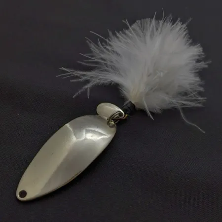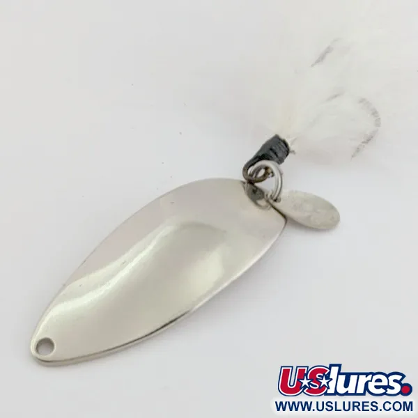 14 grammaa stansattua metallia antaa tälle nikkelöidylle lusikalle tukevan tuntuman pitkiin heittoihin. Kääntöpuolella on ikoninen „Hula Girl” -tanssijan siluetti, joka on alkuperäisen Seneca Lure -tuotannon tavaramerkki ennen kuin Acme osti merkin 1980-luvun alussa. Monet kalastajat uskovat, että tämä tanssijlogo on alkuperäiseen malliin liittyvän kalastusonnen salaisuus. Kirkas nikkeliviimeistely tarjoaa hyvän näkyvyyden eri olosuhteissa. Pituudeltaan 5,5 cm uistimessa on selkeä kyhmyinen profiili ja valkoinen höyhenkolmihaarakoukku, joka lisää hienovaraisen sykkivän visuaalisen elementin. Arvosana 5/5, metallipinta on säilynyt poikkeuksellisen puhtaana ja heijastavana, ja alkuperäiset stanssaukset ovat teräviä ja selkeitä. Tämä tuotekoodilla 24509 varustettu yksilö on peräisin Acmea edeltävältä ajalta.