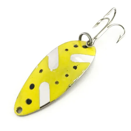Keltainen emali mustilla täplillä ja kiillotetut nikkeliraidat koristavat tämän vintage-mallisen Seneca Little Cleo (Hula Girl) -uistimen etupuolta. Tämä nimenomainen malli, tuotekoodiltaan 8686, painaa 2/3oz (18g) ja on pituudeltaan 2 1/4" (5,5cm). Vieheen kääntöpuolelle on stanssattu legendaarinen hula-tanssija ja "WIGL"-merkintä, mikä on tyypillinen piirre ajalta ennen kuin Acme osti Senecan 1980-luvun alussa. Etupuolen viimeistelyssä on vain vähän kulumia (kuntoarvio 4/5), kun taas kääntöpuoli on säilyttänyt kirkkaan heijastavuutensa. Alun perin Yhdysvalloissa valmistettu lusikkauistin on varustettu alkuperäisellä uistinrenkaalla ja kestävällä kolmihaaralla, joka soveltuu heittoon ja uisteluun. Tanssijakaiverrus on merkittävä yksityiskohta keräilijöille, sillä se poistettiin myöhemmistä tuotantoeristä.