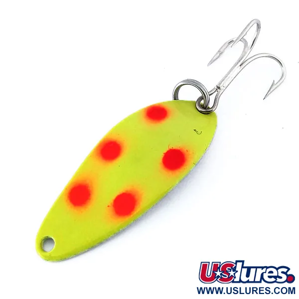 Tämä 7 g (1/4 oz) painava vintage-lusikka on varustettu erottuvalla värikuviolla, jossa on viisi punaista pistettä neonkeltaisella pohjalla. Tämä Little Cleo UV, tuotekoodiltaan 10707, on valmistettu Yhdysvalloissa Seneca Lure -yrityksen toimesta ennen kuin Acme osti brändin 1980-luvun alussa. 4 cm (1 1/2") metallirunko on viimeistelty kiillotetulla nikkelitaustalla, kun taas etupuolella on erityinen UV-reaktiivinen pinnoite, joka hohtaa kirkkaan vihreänä hämärässä. Luokitukseltaan 6 oleva uistin on käyttämätön, ja siinä on säilynyt alkuperäinen tehdaspinta ja osat. Yksi kolmihaarakoukku on terävä ja tukevasti kiinni alkuperäisessä uistinrenkaassa.