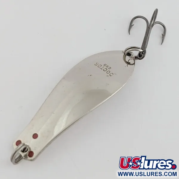 Tämä Prescott Spinnerin nikkelöity lusikkauistin on varustettu koveralla puolella olevalla "DOCTOR 255" -leimalla ja se on pituudeltaan 4,5 cm (1 3/4"). 7 g (1/4 oz) paino ja umpimessinkinen runko mahdollistavat vieheen vakaan uinnin eri kelausnopeuksilla. Kolme pientä punaista pistettä lähellä siiman kiinnityspistettä antavat hienovaraisen visuaalisen kontrastin kirkasta metallipintaa vasten. Kapea pajunlehtimuoto on suunniteltu jäljittelemään pienen syöttikalan profiilia, ja se on usein suosittu muoto hauen tai taimenen kalastuksessa. Tämä yksilö on 5/5-kunnossa, pinta on puhdas ja merkinnät erittäin selkeät. Tuotekoodilla 24455 tunnistettava viehe on hyvin säilynyt esimerkki vuosisadan puolivälin kalastusvälineistä.