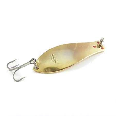 Metallin koveralle puolelle on selkeästi meistattu tunniste "DOCTOR 255", joka on Prescott Spinner -yhtiön tunnusmerkki. Tämä kultaviimeistelty lusikkauistin painaa 1/4 unssia (7 g) ja on 1 3/4 tuumaa (4,7 cm) pitkä. Siinä on kolme erottuvaa punaista pistettä lähellä siiman kiinnityslenkkiä, jotka antavat klassisen visuaalisen tehosteen. Tuotekoodilla 2902 tunnistettu uistin on varustettu yksinkertaisella, terävällä kolmihaarakoukulla, joka on kiinnitetty uistinrenkaalla, säilyttäen tämän amerikkalaisvalmisteisen klassikon alkuperäisen käytettävyyden. Kunto on vankka 4/5, ja pinta on erittäin puhdas, mikä korostaa kultauksen laatua. Käsityö heijastaa kestäviä standardeja, jotka olivat aikoinaan yleisiä Wisconsinin kalastustarvikevalmistuksessa; metallirunko on säilyttänyt alkuperäisen muotonsa ja loistonsa.