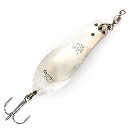 Tämän 7 g (1/4 oz) lusikkauistimen etupuolen nikkelipinnoitteeseen on stanssattu merkinnät "10,000 LAKES ST. PAUL" ja "DOCTOR 255", mikä tekee siitä klassisen palan Minnesotan kalastushistoriaa. Prescott Spinnerin tuotekoodilla 4989 valmistamassa Little Doctor 255 -mallissa on selkeä kontrasti kirkkaan nikkelipinnan ja lämpimän kullanvärisen taustan välillä. Pituudeltaan 4,7 cm (1 3/4") uistin on varustettu vankalla kolmihaarakoukulla ja leikarilla. Tämän yksilön kuntoluokitus on 4/5, ja siinä on hienoisia merkkejä vintage-alkuperästä, vaikka se on säilynyt erittäin puhtaana. Lusikan pisaramainen muoto on yhdysvaltalaisyrityksen tyypillinen muotoilu, joka on tarkoitettu monipuoliseen heittokalastukseen.