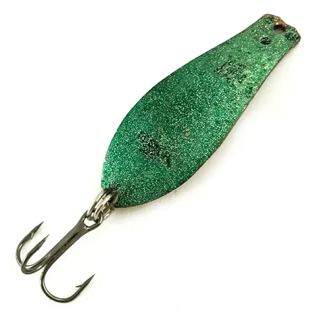 Vihreä hile peittää tämän 7g (1/4oz) lusikkauistimen etupuolen tarjoten heijastavan ja teksturoidun pinnan, joka vangitsee valoa eri kulmista. Tämä Prescott Spinnerin Yhdysvalloissa valmistama Little Doctor 255 (Koodi 5656) on viimeistelty kääntöpuolelta kontrastisella kultahileellä. Pisaranmuotoinen runko on pituudeltaan 4,7 cm (1 3/4"), mikä on monikäyttöinen koko monille makean veden lajeille. Etupuolen leimattu merkintä on terävä ja luettavissa kimaltavaa pintaa vasten. Varustettu tukevalla uistinrenkaalla ja tummalla kolmihaaralla, ja metalliosat ovat säilyneet hyvin. Tämä yksilö on erinomaisessa kunnossa, arvosanalla 5/5. Hieman kaareva metallirunko on suunniteltu heittokalastukseen tai uisteluun, kun kaivataan voimakasta välkettä. Kaksivärinen hilepinnoite on Prescott Spinnerin klassinen tavaramerkki, joka tarjoaa erottuvan visuaalisen profiilin verrattuna tavallisiin kiillotettuihin metallivieheisiin.