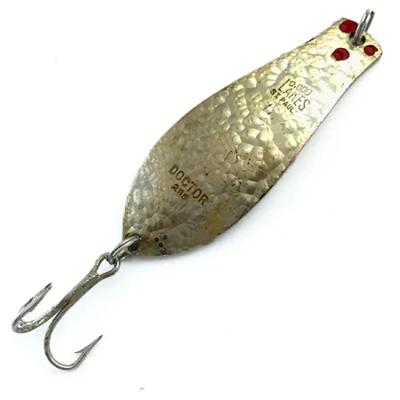 1/4 unssin (7 g) metallirungon kääntöpuolen vasaroidut tekstuurit kontrastoivat upeasti etupuolen harvinaisen kultaisen Crystal-holografisen viimeistelyn kanssa. Metalliin on selvästi stanssattu merkinnät 10,000 LAKES ST. PAUL sekä mallitunnus DOCTOR 255, mikä kertoo sen Prescott Spinner -alkuperästä Minnesotasta, USA:sta. Pituudeltaan 1 3/4" (4,7 cm) oleva yksilö on poikkeuksellisessa kunnossa (arvosana 5/5), ja sen heijastava kultainen pinta ja punaiset yksityiskohdat ovat säilyneet kirkkaina. Rakenteeseen kuuluu alaosaan kiinnitetty vakio-kolmihaarakoukku, joka on suunniteltu heittokalastukseen tai uisteluun. Tämä nimenomainen versio, tuotekoodiltaan 5470, erottuu edukseen kultaisen kristallitekstuuripintansa ainutlaatuisten valoa heijastavien ominaisuuksien ansiosta.