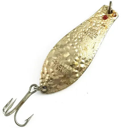 Vasaroituun metalliin on selvästi leimattu 'DOCTOR 255' -merkintä sekä alkuperämaa St. Paul, MN. Tässä 1/4 oz (7 g) painoisessa lusikkauistimessa on Crystal Golden -viimeistely ja syvä vasaroitu pinta, joka on suunniteltu heijastamaan valoa kelauksen aikana. Metallirunko on 1 3/4" (4,7 cm) pitkä ja 5/5-kunnossa, pinta on kirkas ja puhdas. Ylälenkin lähellä on selkeä punainen iskupiste, joka tuo väriä kultaukseen. Tuotekoodilla 6168 luetteloitu uistin on varustettu kolmihaarakoukulla ja uistinrenkailla, jotka ovat erinomaisessa kunnossa. Tämä klassinen amerikkalainen lusikka luottaa painotettuun, kapenevaan muotoiluunsa toimiakseen tehokkaasti sekä heitossa että uistelussa.