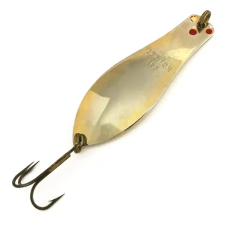Tämän 1/3 unssin (10 g) painoisen lusikkauistimen monipuolisuus tekee siitä erinomaisen valinnan useille makean veden lajeille. Kultapintaiseen metalliin on selkeästi meistetty nimi 'DOCTOR 265', mikä osoittaa sen olevan klassinen Yhdysvalloissa valmistettu viehe. Pituudeltaan 2 1/2" (6,5 cm) olevassa yksilössä on kaksi selkeää punaista pistettä ylälenkin lähellä, mikä luo visuaalisen kontrastin metallirunkoon. Varustukseen kuuluu tukeva kolmihaarakoukku, joka on kiinnitetty uistinrenkaalla pyrstöön, sekä vastaava uistinrengas päädyssä siiman kiinnitystä varten. Tuotekoodilla 7693 kulkevassa vieheessä kultaus näyttää kevyitä käytön jälkiä, mutta sen kuntoarvio on vankka 4/5. Kupera puoli on säilyttänyt kiiltonsa, kun taas kovera tausta on sävyltään hieman himmeämpi ja ikääntynyt, mikä on tyypillistä tämän aikakauden metallivieheille.