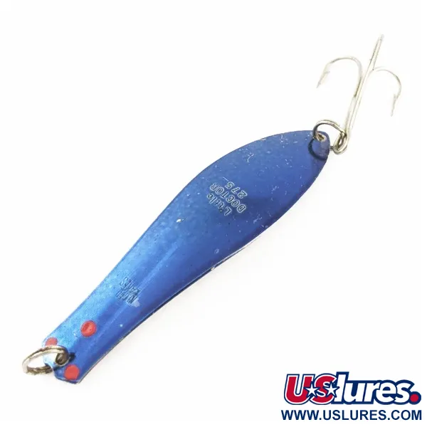 Tässä uistimessa on näyttävä metallinhohtoinen sininen viimeistely, joka luo eloisan kontrastin kirkkaaseen nikkelipinnoitteeseen. Tämä yhdysvaltalaisen Prescott Spinnerin valmistama Little Doctor 275 on kookas lusikkauistin, joka painaa 21 g (3/4 oz) ja on pituudeltaan 9 cm (3 1/2"). Kolme selkeää punaista pistettä lähellä alempaa uistinrengasta toimivat perinteisenä ärsykkeenä, joka erottuu Light Blue / Nickel / Blue -värityksestä. Uistimen etupuolelle on stanssattu selkeästi mallin nimi, ja se on luetteloitu tuotekoodilla 24207. Sekä metallirunko että kolmihaarakoukku ovat erinomaisessa kunnossa, ja vieheen kuntoluokitus on 5/5. Se on hienosti säilynyt esimerkki amerikkalaisesta kalastushistoriasta, ja sen kyynelmuoto on suunniteltu tehokkaaseen heittokalastukseen ja uisteluun eri syvyyksissä.