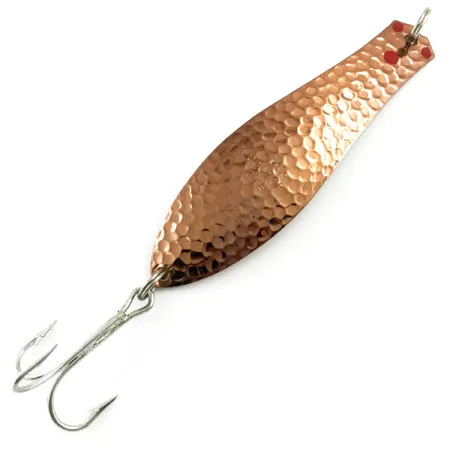 Vasaroitu kupariviimeistely, kuten tässä mallissa, on suunniteltu heijastamaan valoa eri suuntiin – tekniikka, jota amerikkalainen valmistaja Prescott Spinner on suosinut jo pitkään. Little Doctor 275 Lite (Tuotekoodi 6030) painaa 17 g (3/5 oz), ja sen kuperalla puolella on selkeä vasaroitu pinta, joka luo kontrastia takapuolen sileälle, kiillotetulle kuparille. Kaksi pientä punaista väritehostetta on sijoitettu lähelle ylälenkkiä, luoden hienovaraisen kiintopisteen lämmintä metallisävyä vasten. Uistin on 9 cm (3 1/2") pitkä ja se on varustettu tukevalla hopeanvärisellä kolmihaarakoukulla, joka on kiinnitetty vahvalla uistinrenkaalla. Valmistajan leimat ovat selvästi nähtävissä metallissa, kertoen sen USA-alkuperästä. Tämä yksilö on erinomaisessa kunnossa (arvosana 5/5), ja siinä on puhtaat osat ja kirkas viimeistely. Paksu koukku ja vankka metallirakenne viittaavat uistimeen, joka on tehty heittokalastukseen ja uisteluun, joissa kestävyys on ensiarvoisen tärkeää.
