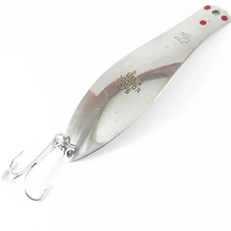 Tämä 3/5 oz (16g) painava Little Doctorin "Thin"-erikoisversio on suunniteltu uisteluun, jossa kevyempi ja virtaviivaisempi profiili on suositeltavampi kuin raskaammat heittomallit. Kiillotettua nikkelipintaa korostavat kolme selkeää punaista pistettä lähellä siiman kiinnityspistettä, mikä on Wisconsinin Prescottista kotoisin olevan Prescott Spinner -yhtiön tunnusomainen muotoiluelementti. Pituudeltaan 3 1/2" (9 cm) lusikan etupuolelle on selkeästi stanssattu mallimerkintä "Little DOCTOR 27S" sekä valmistajan tiedot. Tämä yksilö on 5/5-kunnossa, säilyttäen kirkkaan, heijastavan pintansa ja alkuperäisen hopeanvärisen kolmihaarakoukun. Perässä on uistinrengas, joka varmistaa, että koukku pysyy tukevasti kiinni pitkien uisteluvetojen aikana. USA:ssa valmistettu viehe edustaa vuosisadan puolivälin vintage-kalastusvälineiden toiminnallista yksinkertaisuutta. Sen suippenevan rungon muoto auttaa saavuttamaan halutun syvyyden ilman liiallista massaa. Alapuoli on viimeistelty samalla kiiltävällä nikkelillä, mikä takaa tasaisen välkkeen useista eri kulmista.