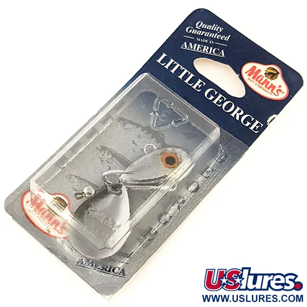 Tämä Mann’s Baitin klassinen tail spinner painaa 12 g (2/5 oz) ja on perusväline kalastajille, jotka tavoittelevat parvikaloja eri syvyyksistä. Tämä tuotekoodilla 12135 varustettu yksilö on käyttämätön alkuperäisessä pakkauksessaan, ja siinä on säilynyt amerikkalaisvalmisteiselle vintage-vieheelle ominainen korkealaatuinen viimeistely. 4 cm (1 1/2") lyijyrungossa on Hammered Nickel / Nickel -viimeistely, joka antaa pientä syöttikalaa jäljittelevän metallisen välkkeen. Rungon alla on yksi kolmihaarakoukku, ja pyrstöön kiinnitetty lippa on suunniteltu pyörimään tasaisessa kelauksessa tai vieheen upotessa pohjaan. Eufaulassa, Alabamassa kehitetty Little George on raskaasti uppoava jigi, joka yltää syviin rakenteisiin tai on heitettävissä pitkälle pinnassa ruokaileville parville. Pakkaus sisältää alkuperäisen brändäyksen syvännsinisessä taustakortissa.
