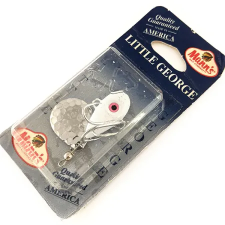 Valkoinen / Vasaroitu Nikkeli -viimeistely yksilöi tämän 4 cm (1 1/2") tailspinnerin, joka on hyvin säilynyt pala Mann's Bait Companyn kalastushistoriaa. 12 g (2/5 oz) painava lyijyrunkoinen Little George on suunniteltu monikäyttöiseksi, ja sitä voidaan kalastaa millä tahansa syvyydellä pinnasta pohjaan. Tässä nimenomaisessa yksilössä on sisäinen tuotekoodi 12184 ja valkoisessa rungossa erottuva vaaleanpunainen silmäyksityiskohta, kuten vintage-WP4-pakkauksessa on mainittu.