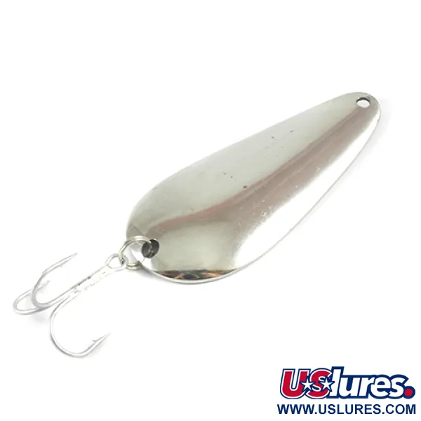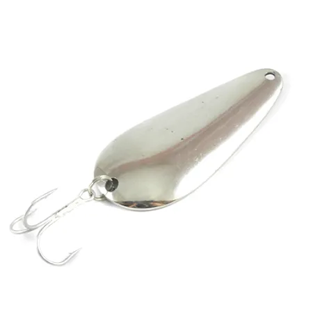 Nikkeli-viimeistelyt, kuten tässä 3" (7,5 cm) lusikassa, olivat Lindy / Little Joe -merkin peruspilari, tarjoten korkean näkyvyyden erilaisissa vesiolosuhteissa. Tähän klassiseen metallilusikkaan on meistetty nimi "Little Joe", ja se painaa 3/5 unssia (17 g), mikä tekee siitä vankan valinnan sekä heitto- että uistelukäyttöön. Tämä yksilö, tuotekoodiltaan 2971, edustaa sitä suoraviivaista amerikkalaista valmistusta, joka määritti merkin tuotannon Yhdysvalloissa. Kolmihaarakoukku on kiinnitetty tukevasti jämäkällä uistinrenkaalla – yksinkertainen mutta tehokas rakenne, joka on kestänyt aikaa. Kunnon osalta heijastava pinta on edelleen kirkas ja hyvin säilynyt, ansaiten arvosanan 4/5. Kuperaa puolta tarkasteltaessa pisaramuodon puhtaat linjat ovat tyypillisiä vuosisadan puolivälin lusikkamuotoilulle, jonka tarkoitus on kerätä valoa. Pään reikä on puhtaasti lävistetty, valmiina lukolle tai suoralle solmulle.
