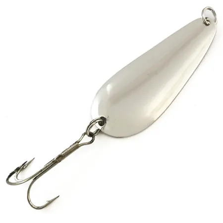 Nikkelöinti peittää tämän 7,5 cm (3") lusikan koko pinnan, tarjoten erittäin välkkyvän viimeistelyn, johon kalastajat ovat luottaneet vuosikymmeniä. 17 gramman (3/5 oz) painoinen metallirunko on riittävän jämäkkä pitkiin heittoihin tai uisteluun, kun tarvitaan voimakasta profiilia. Koveralla puolella on selkeä tuotemerkin leima, joka on Lindy / Little Joe -perinnön tunnusmerkki laadukkaassa yhdysvaltalaisessa valmistuksessa. Tämä nimenomainen yksilö, tuotekoodiltaan 6287, on 5/5-kunnossa ja siinä on hyvin säilyneen vieheen kirkas, virheetön hohde. Varusteet ovat yhtä lailla siistit: tukeva kolmihaarakoukku ja uistinrenkaat on tehty kestämään kovaa käyttöä erilaisissa makean veden ympäristöissä. Sen virtaviivainen, pitkänomainen pisaramuoto on klassinen muotoilu, joka on suunniteltu heijastamaan valoa useista eri kulmista jopa syvissä tai sameissa olosuhteissa.