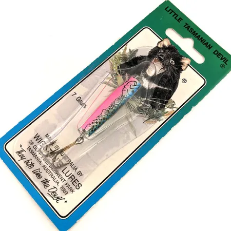 Painoltaan 7g (1/4oz), tämä Little Tasmanian Devil on klassinen Australiassa valmistettu viehe, jonka Wigston's Lures on suunnitellut monipuoliseen heitto- ja uistelukalastukseen. Sen 4 cm (1 1/2") pitkä siivekäs runko on viimeistelty eloisalla Rainbow Trout -kuviolla, jossa on kirkkaan vaaleanpunainen selkäosa, joka vaihtuu sinihopeiseen suomukuvioon hienoilla mustilla täplillä. Käyttämättömänä yksilönä (kunto 6) se on edelleen kiinni alkuperäisessä sinivalkoisessa läpipainopakkauksessaan, josta löytyy ikoninen "They bite like the Devil" -slogan ja Tasmanian alkuperästä kertova 28 Gepp Parade -osoite. Pakkauksen kääntöpuolella on yksityiskohtaiset ohjeet viehelukon kiinnittämiseen tai siiman pujottamiseen suoraan rungon läpi koukkuun ja helmeen. Tämä tuote on luetteloitu koodilla 11568 ja siinä on merkille ominainen perinteinen siivekäs muoto.
