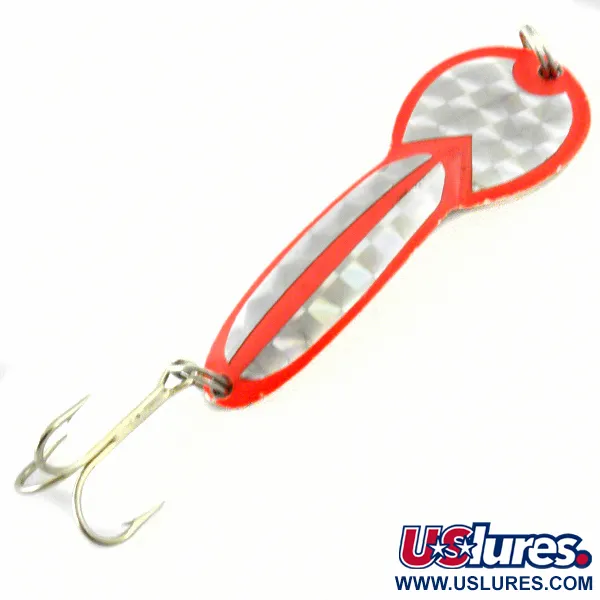 Tämä klassinen 17 g (3/5 oz) painoinen lusikkauistin on viimeistelty näyttävällä fluori-oranssilla ja nikkelillä, jota täydentää holograafinen ruutukuvio. 7 cm (2 3/4") pituiseen runkoon on stanssattu takapuolelle Glen Evans -yhtiön tunnusomaiset merkinnät "LOCO" ja koko "3". Tämä yksilö, tuotekoodiltaan 4610, on huippukunnossa ja ansaitsee 5/5-arvosanan puhtaista pinnoistaan ja hyvin säilyneistä osistaan. Se on suunniteltu sekä heittokalastukseen että uisteluun, ja soveltuu erityisen hyvin hauen kalastukseen seisovassa vedessä noin 1 metrin syvyyteen asti. Metallirakenne tuntuu jämäkältä, ja kirkas oranssi reuna erottuu selvästi heijastavasta nikkelipohjasta. Perässä on tukevaan uistinrenkaaseen kiinnitetty kolmihaarinen koukku, valmiina käyttöön tai keräilykokoelmaan.