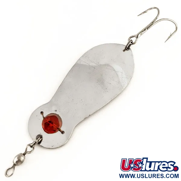 Fasettihiottu punainen lasihelmi toimii silmiinpistävänä keskipisteenä lähellä siimalenkkiä tässä Kanadassa valmistetussa Lucky Strike lusikkauistimessa. Valmistajan leima on selvästi lyöty kääntöpuolelle, ja tämä yksilö edustaa klassista hopeoitua pintaa, josta tuli perusvaruste pohjoisamerikkalaisissa pakkeissa. Painoltaan se on 25 g (1 oz) ja pituudeltaan 8,5 cm (3 1/4"), tarjoten merkittävää massaa heitto- tai uistelukäyttöön. Tämä tuotekoodilla 12653 tunnistettu yksilö on 4/5-kunnossa, säilyttäen kirkkaan ja heijastavan pintansa. Koukussa on mielenkiintoinen muutos: yksi alkuperäisen kolmihaarakoukun haaroista on tarkoituksella katkaistu sen muuttamiseksi kaksihaarakoukuksi, todennäköisesti helpottamaan kalastusta kasvuston tai kivikkoisten rakenteiden seassa.
