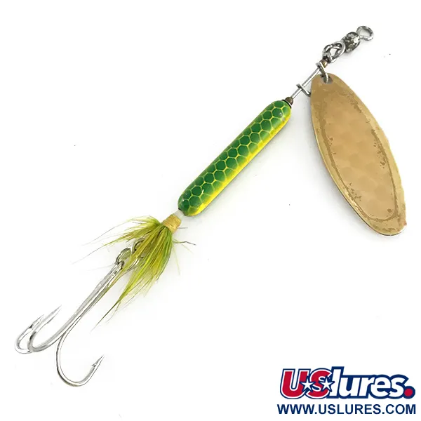 Willow-lehden kultainen viimeistely määrittelee tämän vintage-löydön, jonka messinkisessä pinnassa on selkeä "BANG TAIL 6" -leima. Tuotekoodilla 8411 tunnistetussa Luhr Jensen Bang Tail -lipassa on erottuva kennomainen suomukuvio lieriömäisessä rungossa, jossa metsänvihreä yhdistyy kirkkaankeltaiseen vatsaan. Painoltaan 17 g (3/5 oz), uistin on rakennettu tukevaan lankarunkoon, mikä on ominaista tämän aikakauden USA:ssa valmistetuille kalastusvälineille. Pyrstöpää on varustettu kolmihaarakoukulla, joka on sidottu keltaisilla ja vihreillä kuiduilla, tarjoten tekstuuria ja liikettä. Tämä yksilö on erittäin hyvin pidetty, mikä oikeuttaa kuntoluokitukseen 4/5. Lehden sisäpuolen vasaroitu tekstuuri antaa hienovaraisen visuaalisen yksityiskohdan, joka on suunniteltu heijastamaan valoa lipan pyöriessä tasaisen kelauksen aikana.