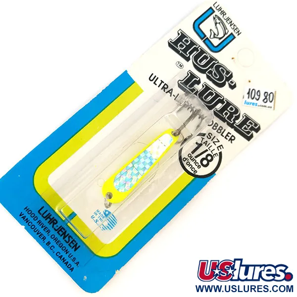 Tämä 1/8oz (4g) painoinen ultrakevyt Hus-Lure on osoitus klassisesta amerikkalaisesta valmistuksesta Luhr Jensenin Hood Riverin tehtaalta Oregonista. 1 1/2" (4cm) lusikassa on eloisa Silver ja Chartreuse -väritys, jota on korostettu prismaattisella ruutukuviolla keskiosassa. Alkuperäispakkauksessa «Wobbler»-nimikkeellä kulkeva uistin on suunniteltu kevyeen heittokalastukseen tai uisteluun. Tämän 10980-mallin keskeinen tekninen ominaisuus on UV-aktiivinen fluoresoiva viimeistely; ultraviolettivalossa chartreuse-reunat hohtavat voimakkaasti parantaen näkyvyyttä hämärässä tai sameassa vedessä. Tämä yksilö on käyttämätön ja on alkuperäisessä vintage-myyntipakkauksessaan. Varustukseen kuuluu tehtaalla asennettu kolmihaarakoukku ja kestävä uistinrengas, ja metallirunkoon on lyöty «Made in USA» -merkintä kääntöpuolelle.