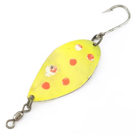 Kirkkaankeltaisella pohjalla ja käsinmaalatuilla punaisilla ja valkoisilla täplillä koristeltu Luhr Jensen Manistee 4 -vieheen viimeistely kertoo sen historiasta vesillä. Tämä 14 gramman (1/2 oz) painoinen lusikkauistin on muotoiltu kaarevaksi, ja sen vankka rakenne on amerikkalaisen valmistajan kehittämä erityisesti lohen ja taimenen kalastukseen. Tässä yksilössä (tuotekoodi 22595) on nähtävissä käytön jälkiä ja maalin kulumista, mikä antaa sille rehellistä luonnetta ja kuntoluokituksen 4/5. Varusteet ovat edelleen luotettavat; vieheessä on yksi laajakidattainen koukku ja tukeva leikari, jotka on kiinnitetty uistinrenkailla. Yhdysvalloista peräisin oleva Manistee-sarja on pitkään ollut suosittu kestävän rakenteensa ja metallilevyn klassisen pisaramaisen muodon ansiosta. Puna-keltainen kuviointi on perinteinen valinta, joka erottuu hyvin eri vesiolosuhteissa, korostaen Luhr Jensenin tunnettua ammattitaitoa.