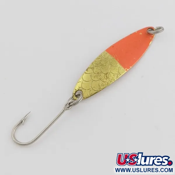 Tämän 3,5 cm (1 1/2") pituisen lusikan kullatulle puolelle etsatut messinkiset suomukuviot luovat klassisen tekstuurin, joka on suunniteltu heijastamaan valoa välivedessä. Metallirunko painaa 2 g (1/16 oz) ja sen alaosassa on kirkkaanpunainen maalaus, joka toimii erinomaisena kontrastipisteenä järvitaimenelle. Kääntöpuolella näkyvät selvästi Luhr Jensen Hood River, Ore. -leima ja mallinimi Needlefish, mikä kertoo sen alkuperämaan USA:n valmistusstandardeista. Tämä kapeaprofiilinen lusikkauistin on suunniteltu vetouisteluun noin 2,5 km/h (1,5 mph) nopeudella ja se toimii loistavasti viileissä kevätvesissä noin 30 metrin (100 ft) vapautuspituudella 8–10 lb siimassa. Kuntoarvio on 5/5; tehtaan viimeistely ja leimat ovat säilyneet terävinä tässä tuotteessa, tuotekoodi 24513.