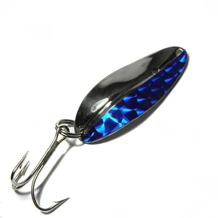 Kiillotetun nikkelipohjan ja sinisen prismakalvon silmiinpistävä yhdistelmä määrittelee tämän amerikkalaisvalmisteisen yksilön ulkonäön. Painoltaan 11 g (2/5 oz), tämä Toddco Main liner on täydellinen esimerkki vuosisadan puolivälin lusikkauistimista. 5 cm:n (2 tuuman) lipassa on erottuva puoli-ja-puoli-viimeistely, jossa heijastava nikkeli kohtaa sinikuvioisen teipin. Viehe on käyttämättömässä kunnossa (5/5), ja sen metallipinnat sekä teippi ovat säilyttäneet alkuperäisen tehdaskiiltonsa. Koukutuksena on hopeanvärinen kolmihaarakoukku, joka on kiinnitetty takaosan uistinrenkaaseen. Tuotekoodilla 0412 merkitty, USA:ssa valmistettu viehe edustaa sitä suoraviivaista suunnittelua, jota Toddco käytti lusikkauistimissaan. Lusikan kovera alapuoli on viimeistelty samalla kiillotetulla nikkelillä, mikä mahdollistaa tasaiset välähdykset eri kulmista.