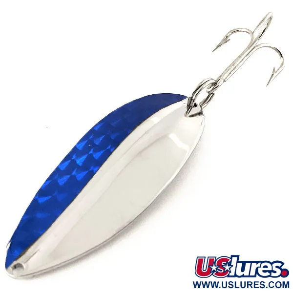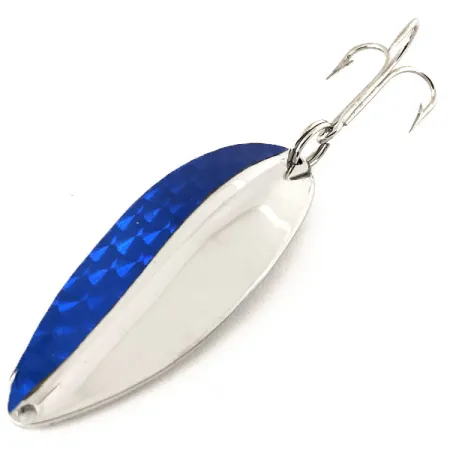Tämä tasan 6,5 cm (2 1/2") pitkä TODDCO Main liner edustaa muotoilua, joka oli amerikkalaisten pakkiperinteiden vakiovaruste vuoteen 1980 asti. Sen nikkeli/sininen-viimeistely on erityisen silmiinpistävä: puolet kuperasta puolesta on päällystetty sinisellä prismateipillä, joka heijastaa valoa terävän geometrisen kuvion läpi. Alla oleva metalli on kirkasta, kiillotettua nikkeliä, joka jatkuu täysin hopeanväriseen koveraan puoleen asti. Tämä tuotekoodilla 11844 tunnistettu yksilö painaa 21 g (3/4 oz), mikä tekee siitä vankan valinnan pitkiin heittoihin. Varustukseen kuuluu yksi suuri kolmihaarakoukku, joka on kiinnitetty kestävällä uistinrenkaalla. Siiman kiinnityspiste päädyssä on yksinkertainen, siististi porattu reikä. Tämä USA:sta peräisin oleva ja hienosti säilynyt kalastushistorian kohde on kunnoltaan täysi 5/5, ja se on säilyttänyt korkean kiillon sekä metallissa että koristeellisessa sinisessä osassa.