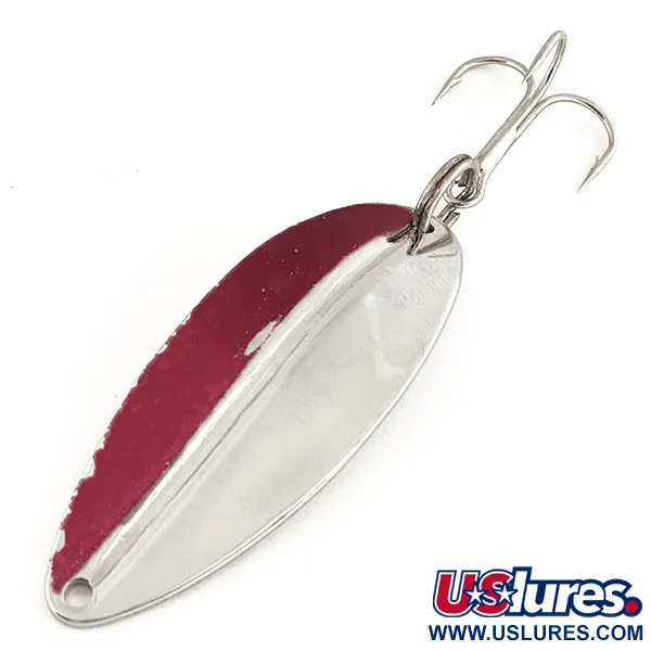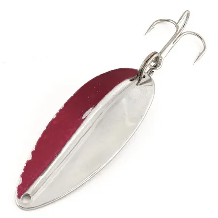 Näyttävä tummanpunainen diagonaalinen raita peittää puolet kuperasta pinnasta, muodostaen jyrkän kontrastin tämän vintage-lusikan kiillotetulle nikkelipinnalle. Tämä TODDCO Main liner, tuotekoodiltaan 12221, on 5,5 cm (2 1/4") pitkä ja painaa 12,5 g (2/5 oz). Valmistettu Yhdysvalloissa ennen vuotta 1980, uistimessa on erottuva pitkittäinen harjanne keskellä metallirunkoa, mikä antaa sille ainutlaatuisen profiilin verrattuna litteämpiin malleihin. Kääntöpuoli on puhdasta, maalaamatonta nikkeliä, joka osoittaa alkuperäisen pinnoitteen laadun. Hopeanvärinen kolmihaarakoukku on kiinnitetty tukevasti uistinrenkaalla perään. Tämä yksilö on erinomaisessa kunnossa, ja sen värit sekä metallipinnat ovat säilyneet kirkkaina (kuntoarvio 5/5). Kapeassa päässä on siististi porattu kiinnitysreikä suoraa asennusta varten.