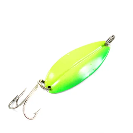 Fluoresoiva keltainen vaihtuu kirkkaan vihreään tämän 2 1/4" (5,5 cm) Main liner -lusikkauistimen yläpuolella. Amerikkalaisen TODDCO-valmistajan tuotekoodilla 1989 valmistama uistin on merkittävä löytö keräilijöille, sillä merkkiä ei enää valmisteta. 1/2 oz (14 g) painoinen muotoilu hyödyntää klassista kuperaa muotoa yhdistettynä kiillotettuun nikkelitaustaan, mikä luo erittäin kontrastisen visuaalisen profiilin heitto- tai vetouistelussa. Varustukseen kuuluu terävä kolmihaarakoukku ja uistinrenkaat, jotka ovat säilyneet erinomaisessa kunnossa (arvosana 5/5). Tehdasmaalaus ja metallipinnoite ovat säilyneet hyvin, mikä osoittaa perinteistä yhdysvaltalaista laadukasta käsityötä.