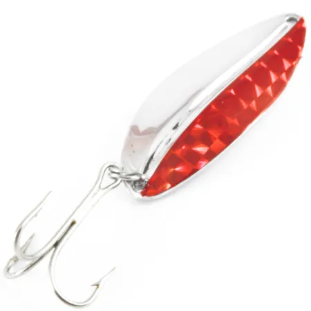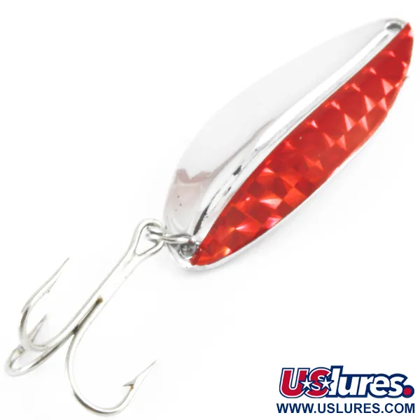 Tämä 12,5 g (2/5 oz) painava vintage-amerikkalainen lusikkauistin on taidonnäyte TODDCO-valmistajalta, joka lopetti tuotantonsa Yhdysvalloissa noin vuonna 1980. Kirkas, vinoneliökuvioinen punainen upotus luo jyrkän visuaalisen kontrastin 5,5 cm (2 1/4") pitkään kiillotettuun nikkelirunkoon. Tässä Main liner -mallissa (tuotekoodi 3671) on perinteinen pisaramainen muoto, kovera taustapuoli ja yksi siiman kiinnityspiste kapeassa päässä. Varustukseen kuuluu hopeanvärinen kolmihaarakoukku, joka on kiinnitetty uistinrenkaalla. Tämä yksilö on 5/5-kunnossa, ja siinä on hyvin säilynyt metallipinta sekä tukevasti kiinnitetty prismamainen punainen teippi.