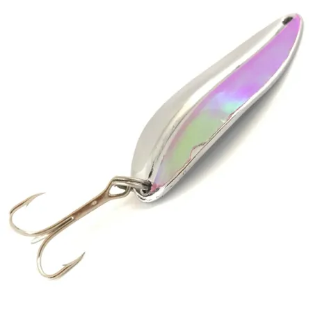 Nikkelipinnoite yhdistettynä hohtavaan Purple and Green Pearl -sisäosaan antaa tälle lusikalle selkeän visuaalisen profiilin, joka heijastaa valoa eri tavalla jokaisesta kulmasta. Tämä TODDCO Main liner, tuotekoodiltaan 4704, on pituudeltaan 5,5 cm (2 1/4") ja se valmistettiin Yhdysvalloissa ennen kuin yritys lopetti tuotantonsa vuoden 1980 tienoilla. Painoltaan 12,5 g (2/5 oz) uistin on suunniteltu heitto- ja uistelukäyttöön, jossa tarvitaan raskaampaa metallista olemusta. Varustukseen kuuluu uistinrenkaalla kiinnitetty terävä kolmihaarakoukku, joka takaa kestävyyden kelauksen aikana. Korkean säilyvyysasteensa ansiosta viimeistely on kirkas ja helmiäiskoriste on säilynyt ehjänä, mikä ansaitsee 5/5-kuntoarvion. Nokan pieni, siisti aukko toimii pääasiallisena kiinnityspisteenä lukolle tai perukkeelle.