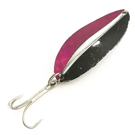 Tarkalleen 5,5 cm (2 1/4") pituinen Toddco Main liner on klassinen osa amerikkalaista kalastushistoriaa, ja sitä valmistettiin Yhdysvalloissa vuoteen 1980 asti. Painoltaan 12,5 g (2/5 oz) lusikkauistin on varustettu selkeällä keskiharjanteella, joka jakaa etupuolen kahteen visuaalisesti erilaiseen puoliskoon: syvän magentanväriseen prismateippiin ja kiinteään mustaan pintaan. Kääntöpuoli on kiillotettua nikkeliä, mikä tarjoaa voimakkaasti välkähtävän pinnan tummemman etupuolen vastapainoksi. Tämä yksilö, tuotekoodiltaan 6461, on 4/5-kunnossa ja sen metallipinnat ovat säilyttäneet kirkkaan kiiltonsa; vain maalatuissa osissa on vähäisiä ikääntymisen merkkejä. Alkuperäisiin varusteisiin kuuluu tukeva kolmihaarakoukku, joka on kiinnitetty ruostumattomasta teräksestä valmistetulla uistinrenkaalla pisaranmuotoisen rungon tyveen.