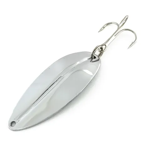 Nikkelipinnoite antaa peilimäisen viimeistelyn tälle pajunlehden muotoiselle Main liner -lusikalle, jota TODDCO valmisti USA:ssa vuoteen 1980 asti. Sen 2 1/4" (5,5 cm) runko on varustettu selkeällä keskiharjanteella, joka lisää metallin jäykkyyttä. Etuosassa on siisti reikä siiman suoraa kiinnitystä varten, ja 12,5 g (2/5 oz) painoisen vieheen perässä on vankka kolmihaarakoukku, joka on kiinnitetty vahvalla uistinrenkaalla. Kuntoluokitukseltaan 5/5 oleva pinta on säilynyt kirkkaana ilman näkyvää kulumista. Tämä tuotekoodilla 8606 tunnistettu yksilö on hieno esimerkki vuosisadan puolivälin amerikkalaisesta lusikkauistimesta, joka on tarkoitettu heittokalastukseen tai uisteluun.