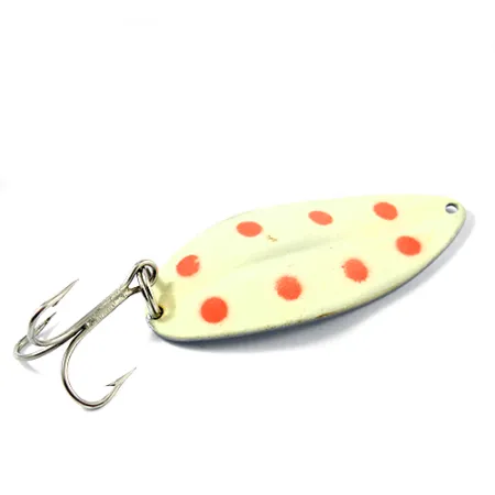 Fluoresoivat punaiset täplät täydentävät tämän TODDCO Main liner Glow -lusikkauistimen itsevalaisevaa valkoista viimeistelyä. Tämä klassinen yhdysvaltalaisvalmisteinen uistin painaa 3/4 oz (21 g), ja siinä on selkeä kohotettu keskiharjanne, joka määrittelee sen profiilin ja antaa rungolle jäykkyyttä. Etupuoli on päällystetty paksulla valopigmentillä, joka on tarkoitettu hämärään tai syvän veden kalastukseen, kun taas kääntöpuolella on puhdas, kiillotettu nikkeliviimeistely. Uistimen pituus on 6,5 cm (2 1/2"), ja se on varustettu yhdellä vahvalla kolmihaarakoukulla, joka on kiinnitetty kestävällä uistinrenkaalla. Tämä yksilö (tuotekoodi 2662) on 5/5-kunnossa, ja siinä on tallella alkuperäinen kiilto ja tarkka maalipinta ilman käytön jälkiä. Valmistusmaa on Yhdysvallat, mikä heijastaa laadukasta kotimaista kalastustuotantoa ajalta, jolloin kestävyys oli vakio-ominaisuus raskaan makean veden tai kevyen meriveden heittokalastuksessa.