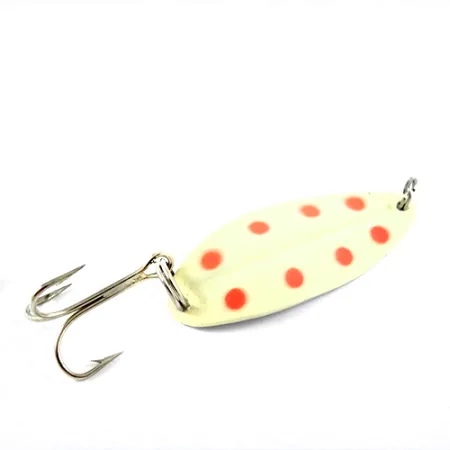 Tämä 12,5 g (2/5 oz) painoinen metallirunko sisältää sille ominaisen pitkittäisuran selkäpuolella, mikä on nykyisin toimintansa lopettaneen amerikkalaisen valmistajan TODDCO:n tekninen tavaramerkki. Tämä Main liner Glow -yksilö, tuotekoodiltaan 2839, on pituudeltaan 5,5 cm (2 1/4") ja siinä on luminoiva valkoinen etupuoli, jota koristavat kahdeksan punaista pistettä. Kääntöpuolella on korkeakiiltoinen nikkeliviimeistely, joka lisää heijastavuutta pimeässä hohtavaan muotoiluun. Varusteet ovat huomattavan puhtaat, ja niihin kuuluu alkuperäinen kolmihaarakoukku ja uistinrengas. Kuntoarvion ollessa 5/5, maali- ja pinnoitepinnat osoittavat, kuinka hyvin tästä vintage-lusikkauistimesta on pidetty huolta vuosien varrella. Sen pimeässä hohtavat ominaisuudet on suunniteltu erityisesti näkyvyyteen hämärässä tai syvissä vesikerroksissa.