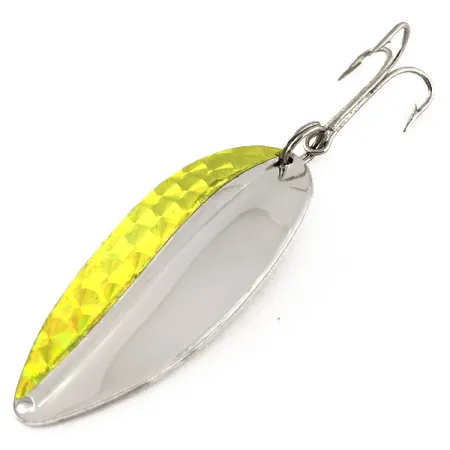 Tämä 6,5 cm (2 1/2") pituinen lusikkauistin on varustettu kaksiosaisella pintakuviolla, jossa yhdistyvät kiillotettu nikkeli ja tekstuuroitu, holograafinen keltainen teippi. 21 g (3/4 oz) painoinen TODDCO Main liner UV on suunniteltu pitkiin heittoihin tai tiettyjen syvyyksien saavuttamiseen uistelussa. Sen "Nickel / Green" -väritys tarjoaa kaksitehoisen visuaalisen vaikutuksen: toinen puoli heijastaa valoa kiillotetusta metallista, kun taas fluoresoiva teippipuoli on suunniteltu reagoimaan UV-valoon. Hämärässä tämä erityinen viimeistely säteilee kirkasta vihreää hohdetta, mikä on tuotekoodin 11434 tekninen tunnusmerkki. Tämä USA:ssa valmistettu yksilö on 5/5-kunnossa, ja siinä on tallella alkuperäinen tehdaskiilto ja selkeä holograafinen suomukuviointi. Terävä vakiomallinen kolmihaarakoukku on kiinnitetty pyrstöön vahvalla uistinrenkaalla.